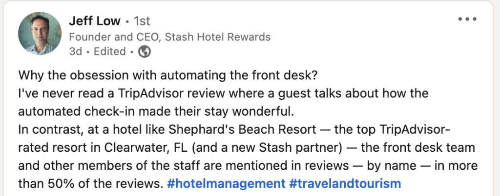 I’m seeing this from many of those closest to the hospitality industry, like this from Jeff Low: