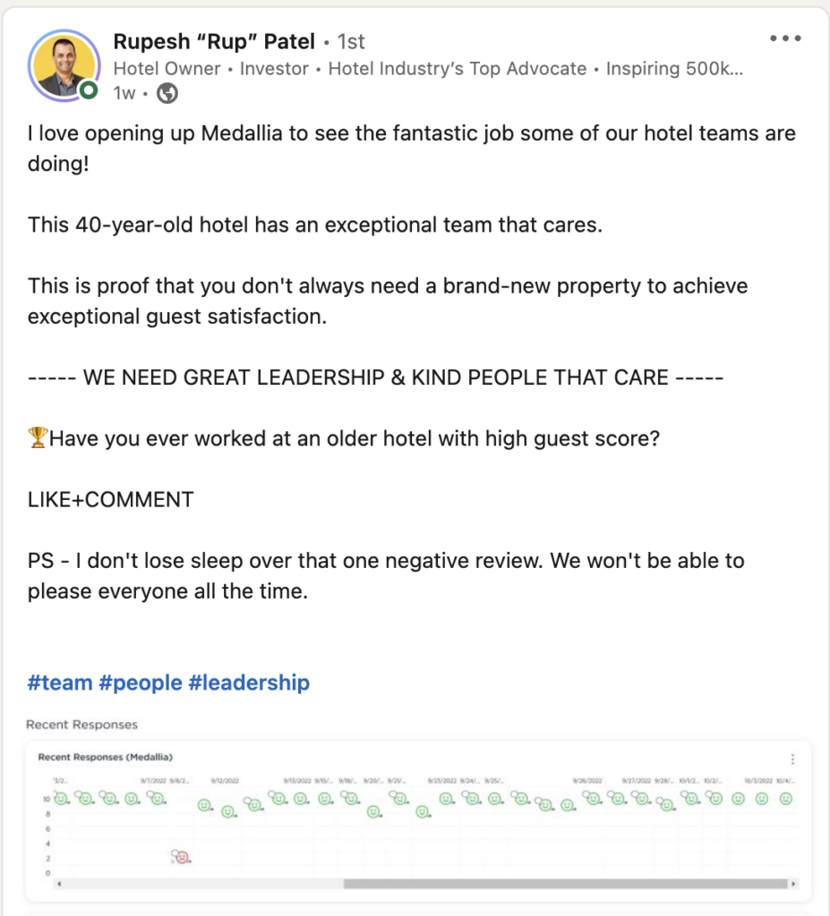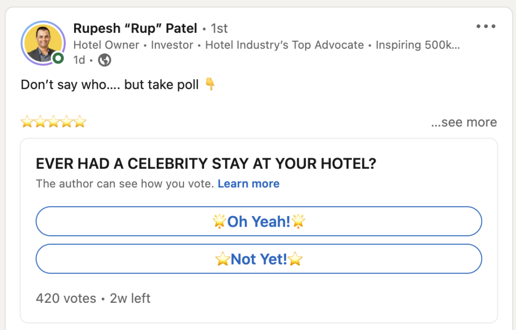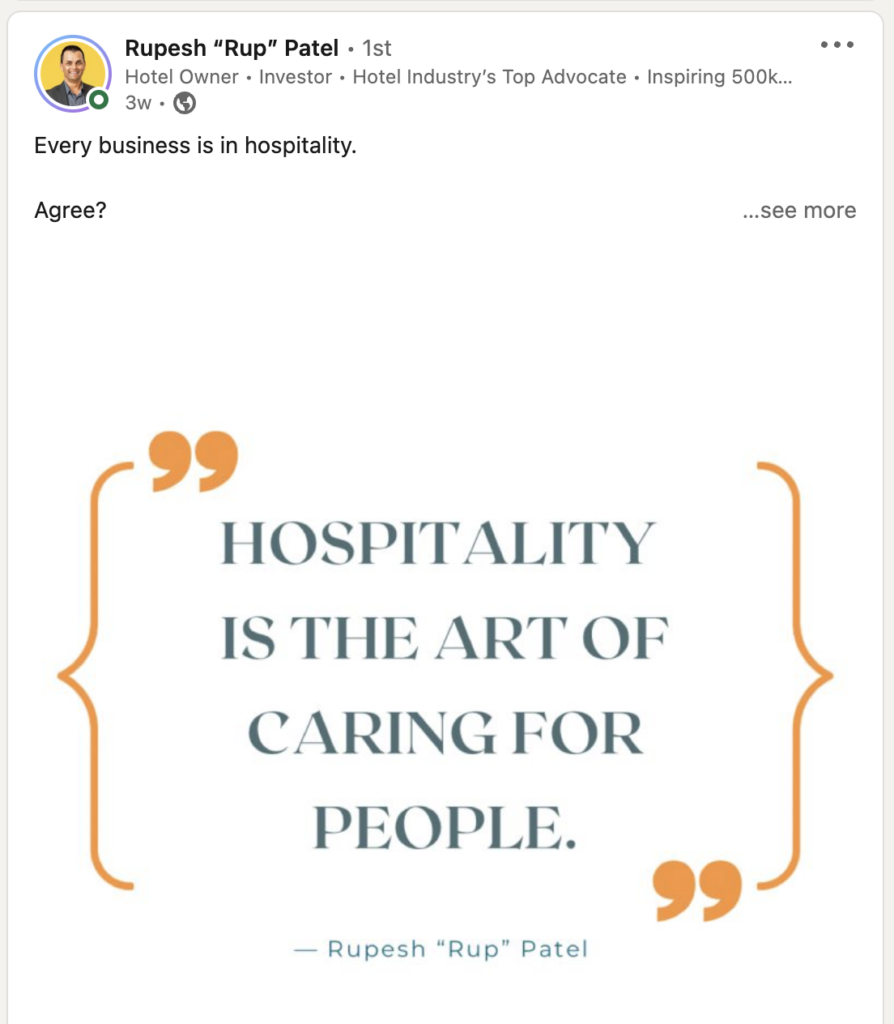 Rupesh Patel is a hotel owner, operator, and investor with more than 50,000 followers on LinkedIn. If there is one person to watch, he may be the one! Rupesh posts a mix of behind-the-scenes views into hotel operations, polls and questions, and inspirational quotes.