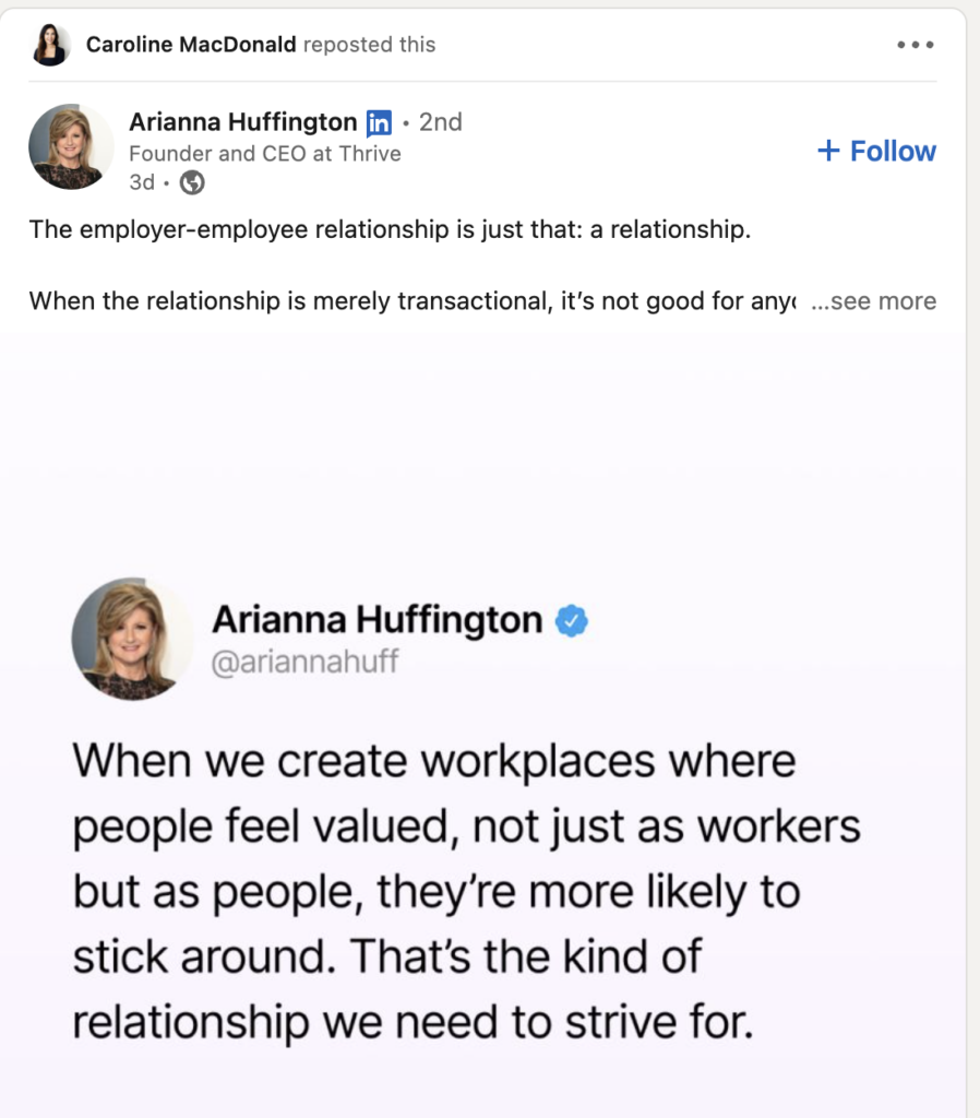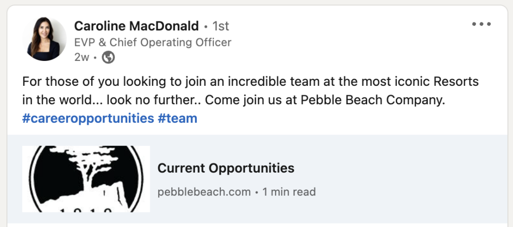 Caroline MacDonald was CMO at Auberge Resorts, then SVP of Operations at Rosewood Hotel Group before her current role leading operations for the Pebble Beach Company as COO. She has nearly 30,000 followers on LinkedIn and posts a mix of quotes from others, insightful articles she’s found, and career opportunities on her teams.