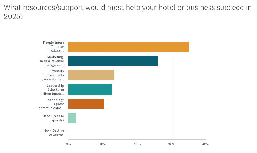 When asked what resources would most help their business succeed in 2025, hoteliers overwhelmingly chose “people” – more staff, better talent, training & development: